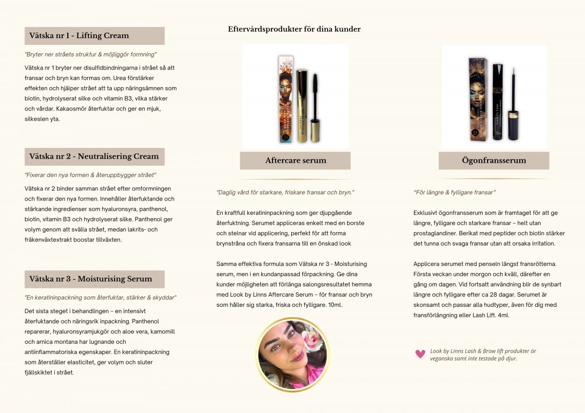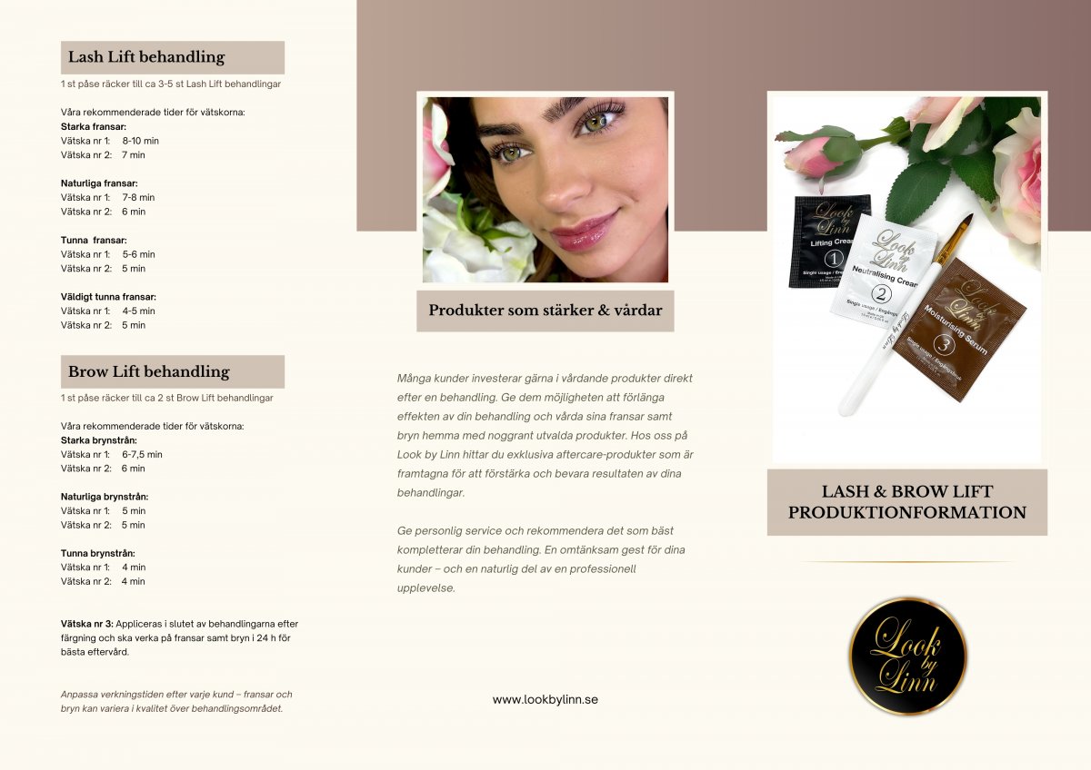 När du är helt klar med din Brow Lift inkl färngning appliceras serumet. Viktigt att du applicerar serumet efter den skapade brynformen då produkten torkar och håller stråna fixerade. Brynstråna kommer både se mörkare och fylligare ut efter applicering. Rekomendationen till kunden är att låta stråna vara orörda och torra i 24 efter behandling, låt serumet ligga kvar på brynen under dessa timmar.